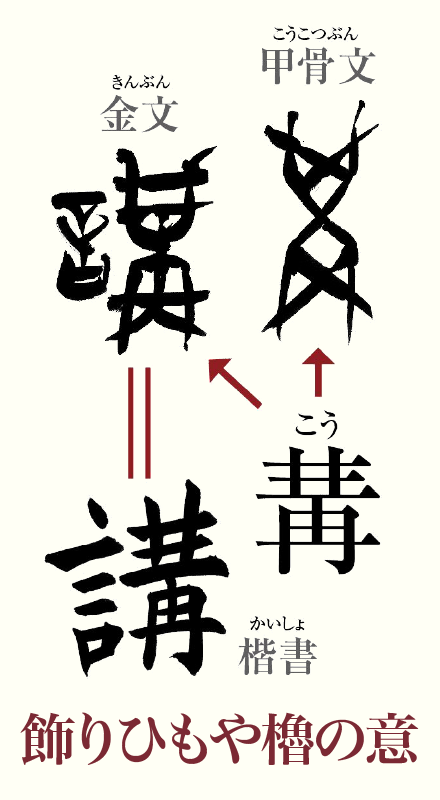 甲骨文では上下につなぎ合わせた飾りひもの象形となり、「組む」「組み合わす」を意味します。これに「女」を付けた「媾」は結婚の意に。交戦国が互いに取り決めて平和状態に戻ることを「媾和」(常用漢字では講和)と書きます。