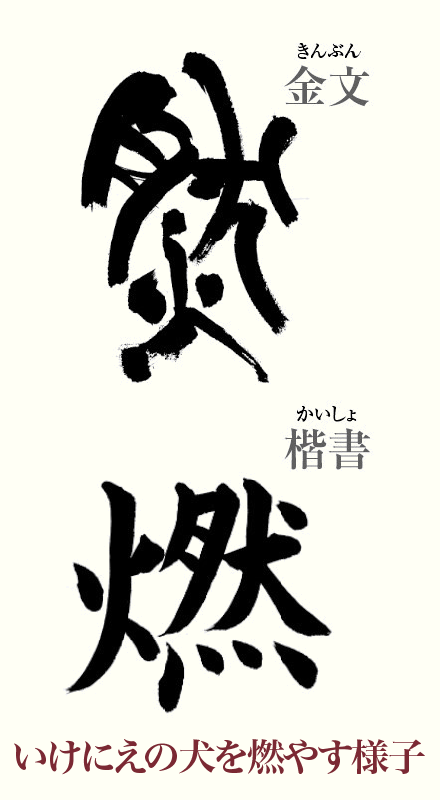 構成を調べてみると、犬の象形である「犬」、肉を表す部首の「にくづき」、その両者を合わせた「ぜん」(犬の肉の意)が、「然」の上部に配置されています。その下には、火が激しく燃える様子を表す部首の「れんが」があります。古代中国では、犬がいけにえとして供えられたようです。