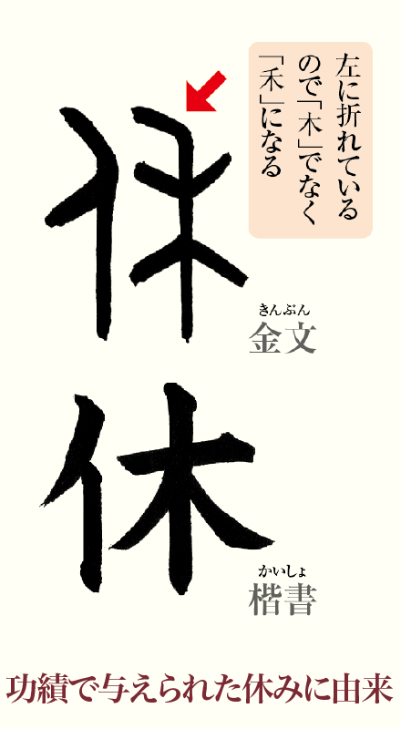 品物以外にも休みが与えられたので、「休」は徐々に「休む」の意味で使われるようになりました。「禾」の1画目はやがて省略され、「木」の形になったのです。