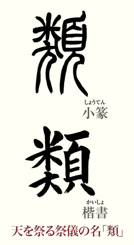似た者同士が自然に集まることを「類は友を呼ぶ」と言いますが、今回は「類」を見ていきましょう。「類」の本来の字は「類」で、「米」「犬」「頁」から成る会意文字です(古書体の小篆参照)。「米」と「犬」は祭壇に供えるもので、犬はいけにえ。「頁」は儀式用の衣服や冠をつけた人が礼装して拝むことを意味しています。これを「類」と称し、天を祭る祭儀の名となりました。現代のわれわれが書く「類」は、「犬」の部分が「大」と表記されています。「大」は人が手足を広げて立つ姿の正面の形を表しています。「類」は「似る」「類い」の意味で使われるようになりました。祭りの意味を残す字としては、祭卓を象った「示」を加えた「禷」が作られました。