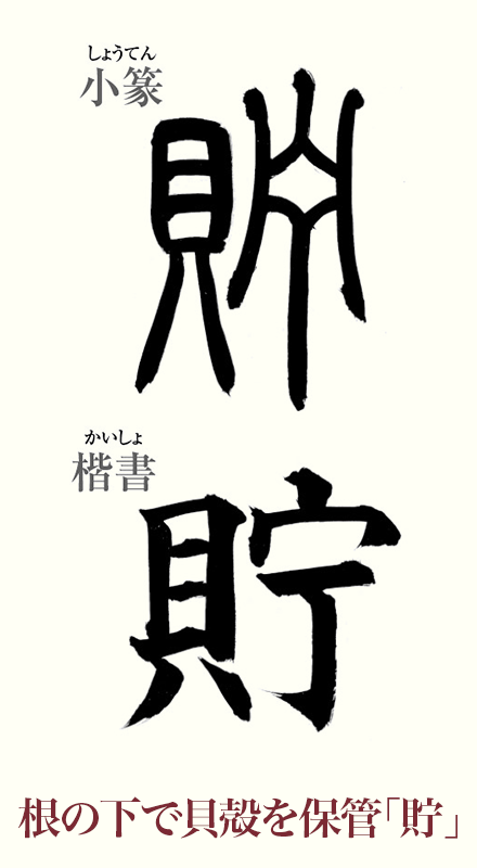 この2つを組み合わせた「貯」の字は、屋根の下に貝殻=お金を保管している様子。「財産を守るという意識」や「生活の安定を願う気持ち」が込められているようです。