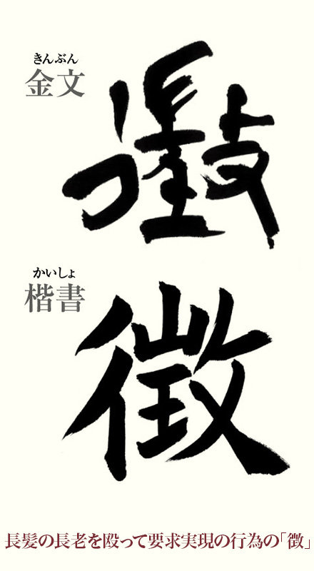 」は敵の長髪の長老を指します。「彳」は自分の土地から敵の土地への通路と考えられていたので、そこで長老を捕らえて「攴」(手に持つ枝)で殴って呪力を刺激し、殴る側の要求の実現を求める行為の意味となります。