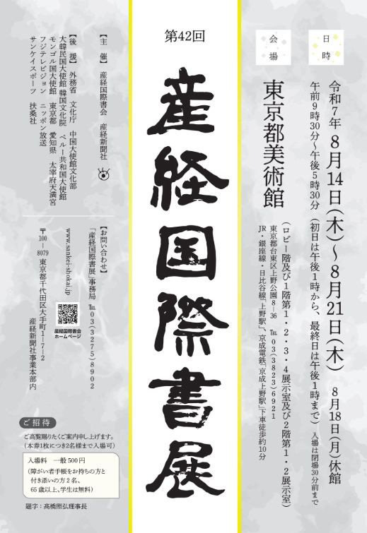入場をご希望される方は招待ハガキがありますので、産経国際書会事務局まで事前にお申し込みください。こちらからお送りいたします(無くなり次第終了)。