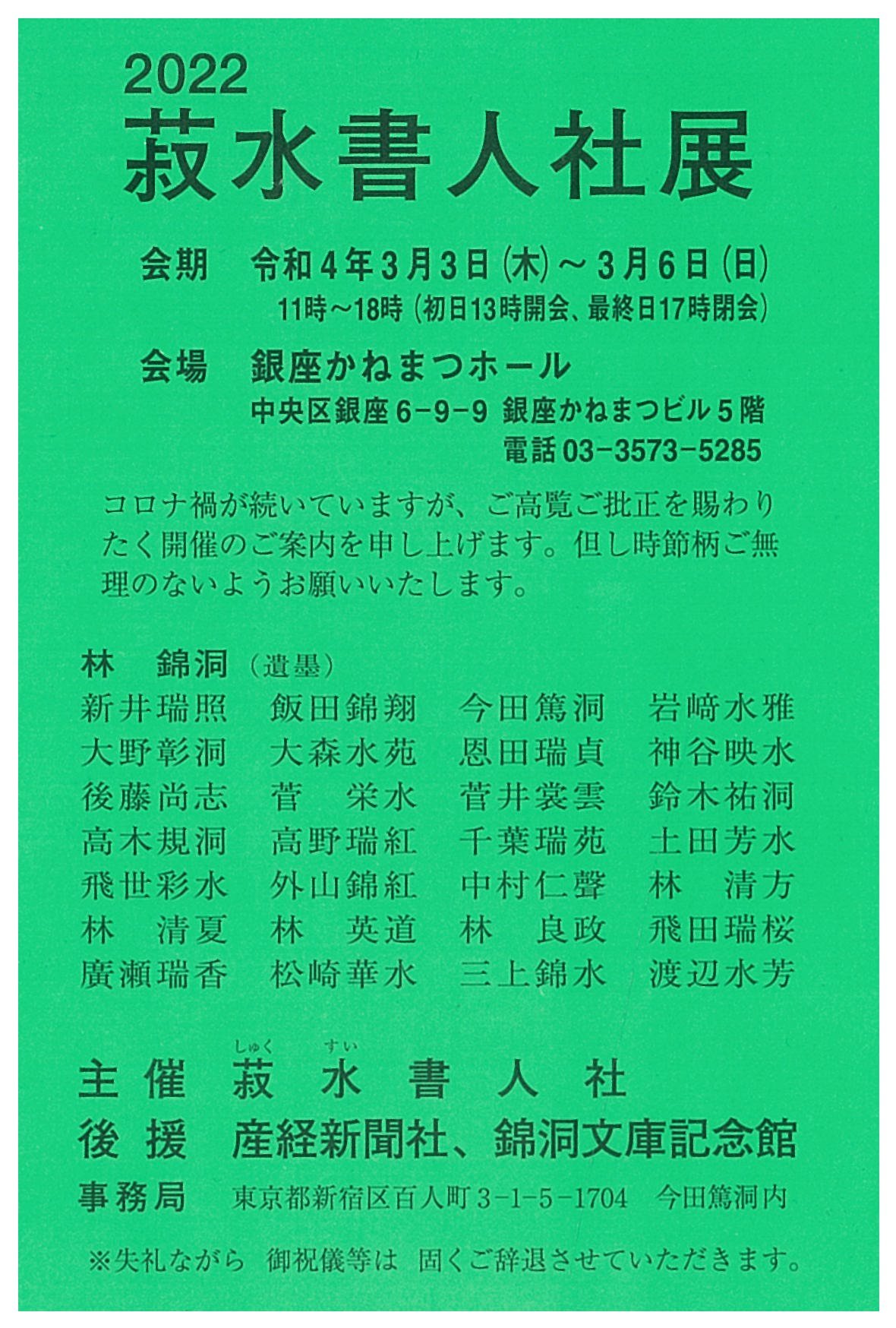 | 展覧会名 会期 会場 団体・代表名 | 2022 菽水書人社展 3月3日(木)~3月6日(日) 銀座かねまつホール 菽水書人社・今田篤洞 |