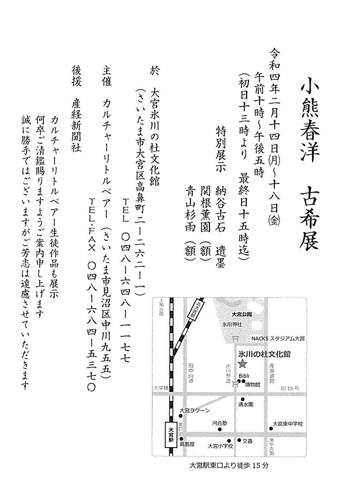 | 展覧会名 会期 会場 団体・代表名 | 小熊春洋 古希展 2月14日(月)~2月18日(金) 大宮氷川の杜 光華書道会・鶴田秀紅 |