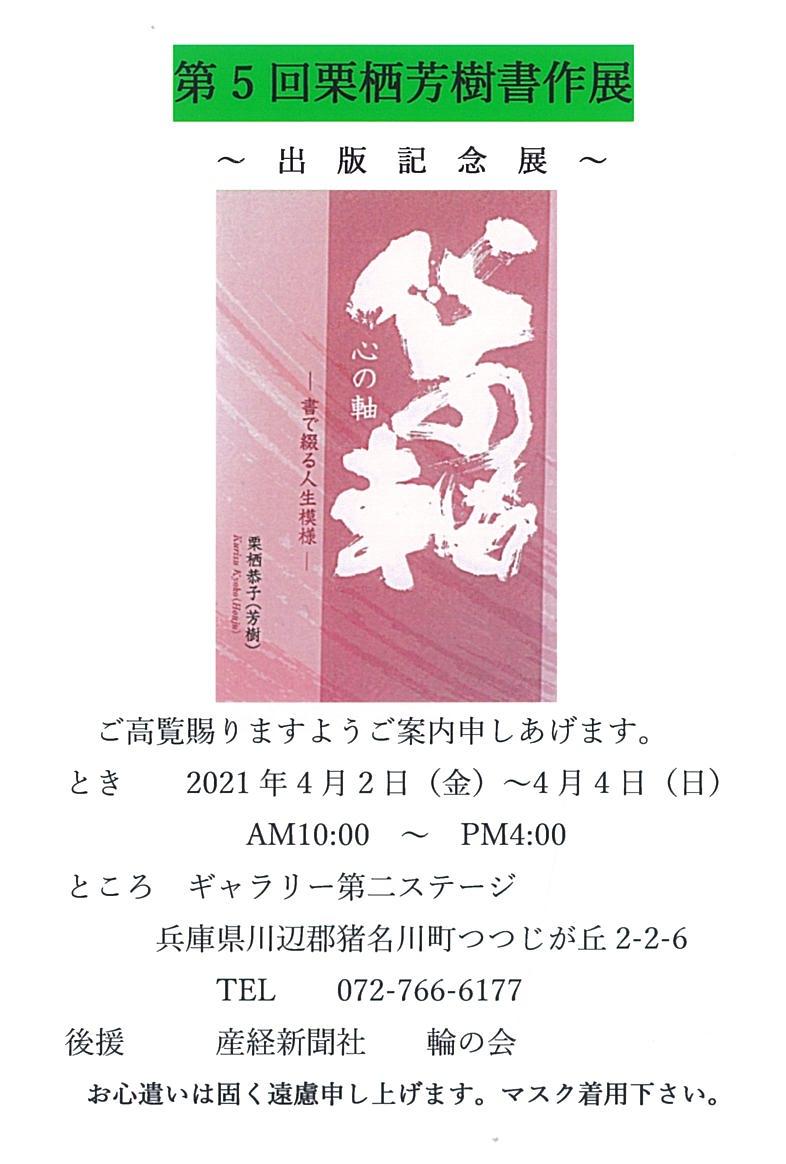 | 展覧会名 会期 会場 団体・代表名 | 第5回栗栖芳樹書作展 ~出版記念展~ 4月2日(金)~4月4日(日) ギャラリー第ニステージ(兵庫県猪名川町) 輪の会・小野亭良 |
