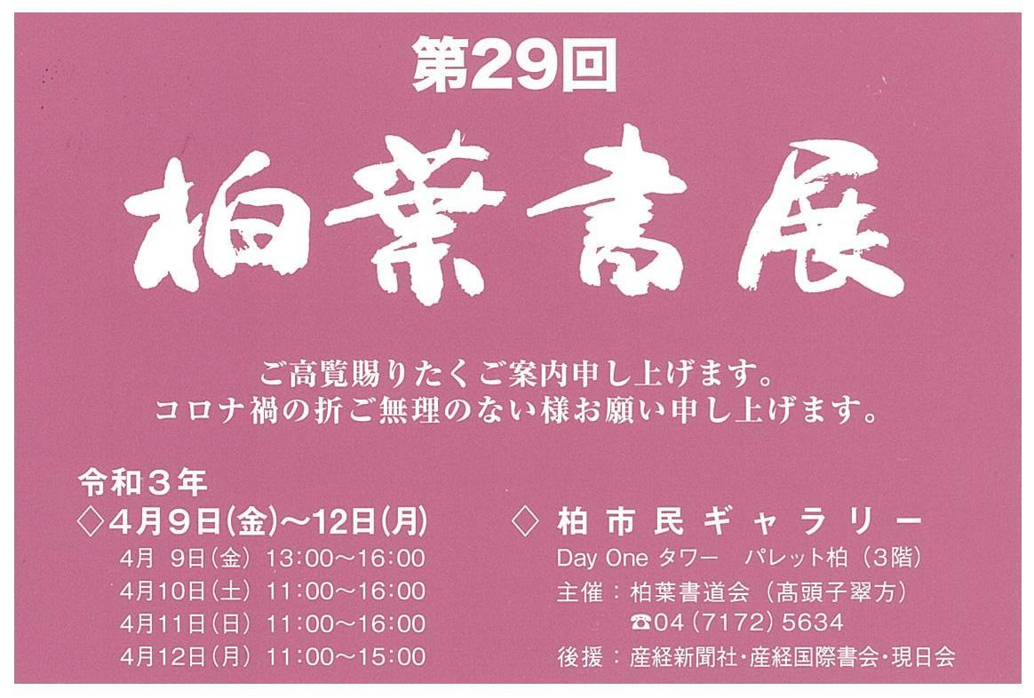 | 展覧会名 会期 会場 団体・代表名 | 第29回 柏葉書展 4月9日(金)~4月12日(月) 柏市民ギャラリー 柏葉書道会・髙頭子翠 |