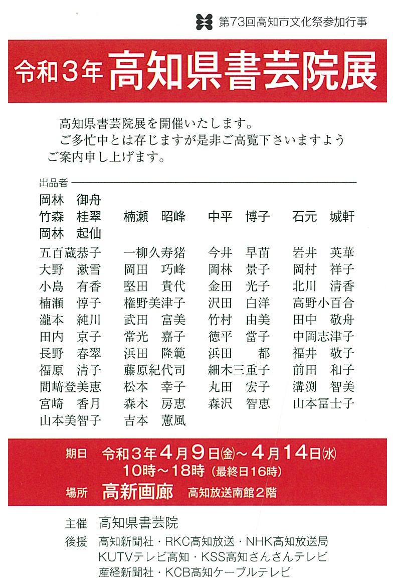 | 展覧会名 会期 会場 団体・代表名 | 令和3年 高知県書芸院展 4月9日(金)~4月13日(火) 高新画廊 高知県書芸院・岡林御舟 |