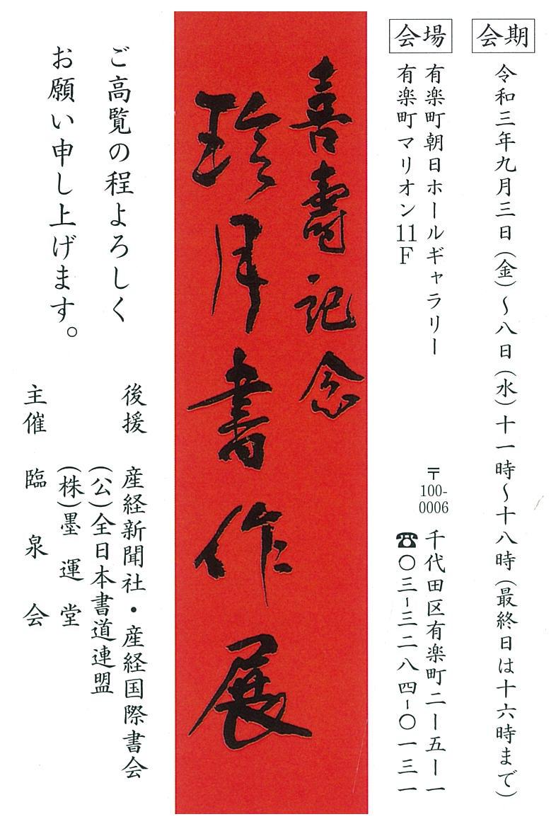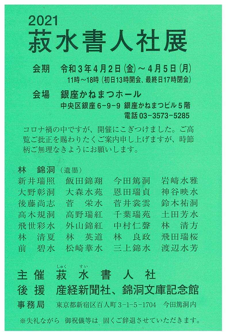 | 展覧会名 会期 会場 団体・代表名 | 2021 菽水書人社展 4月2日(金)~4月5日(月) 銀座かねまつホール 菽水書人社・今田篤洞 |