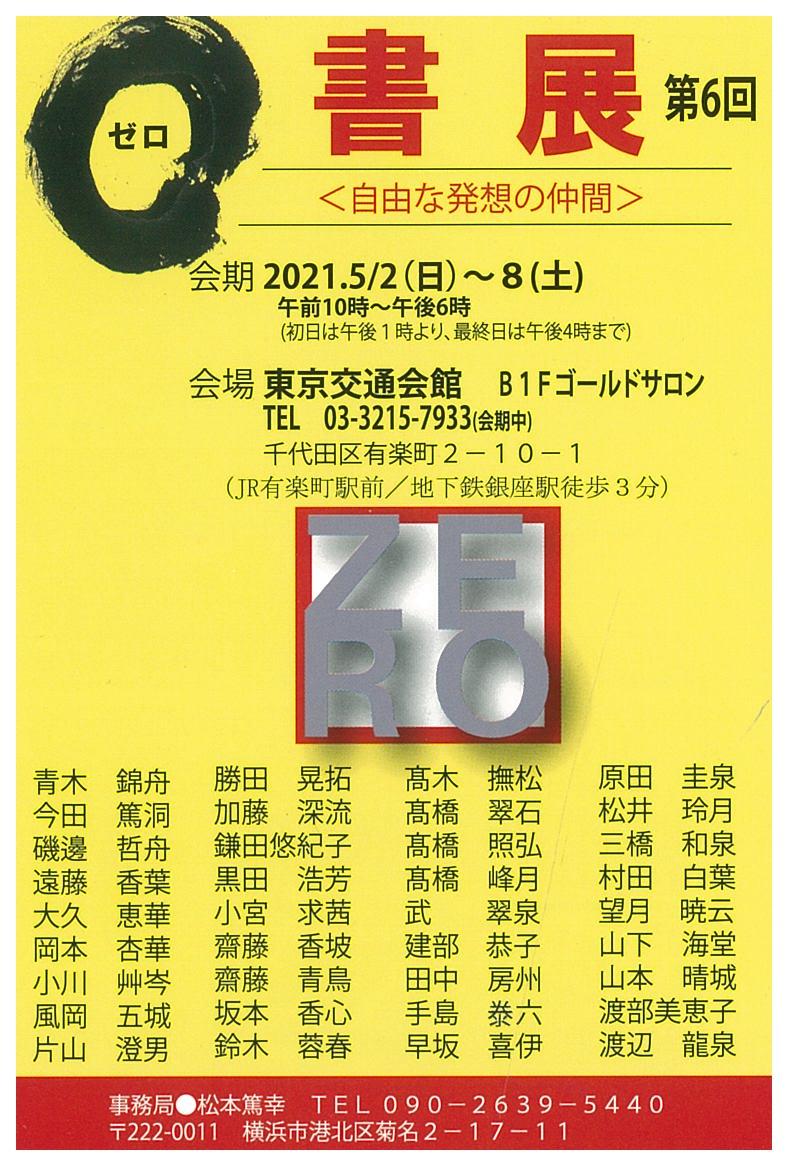 | 展覧会名 会期 会場 団体・代表名 | 第6回 ゼロ書展 5月2日(日)~5月8日(土) 東京交通会館B1Fゴールドサロン ゼロ展事務局・松本篤幸 |