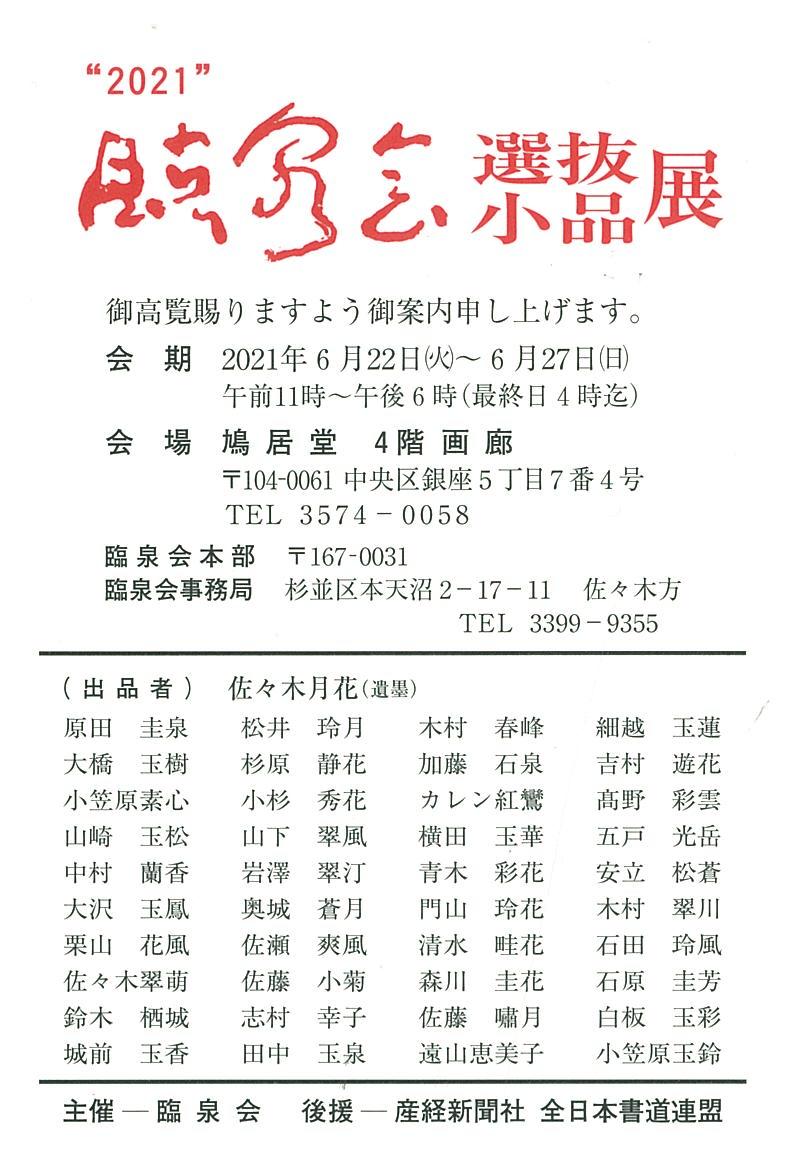 | 展覧会名 会期 会場 団体・代表名 | 2021 臨泉会選抜小品展 6月22日(火)~6月27日(日) 銀座鳩居堂画廊4階 臨泉会・原田圭泉 |