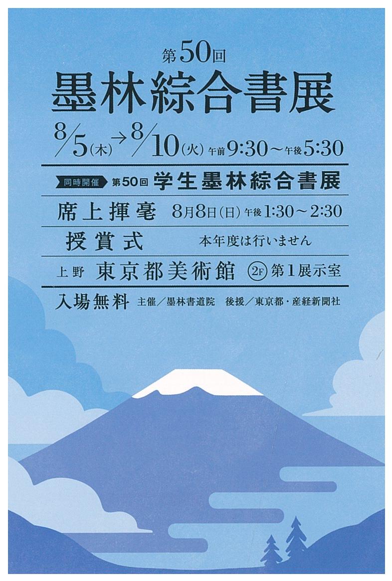 | 展覧会名 会期 会場 団体・代表名 | 第50回 墨林綜合書展 8月5日(木)~8月10日(火) 東京都美術館 墨林書道院・遠藤乾翠 |