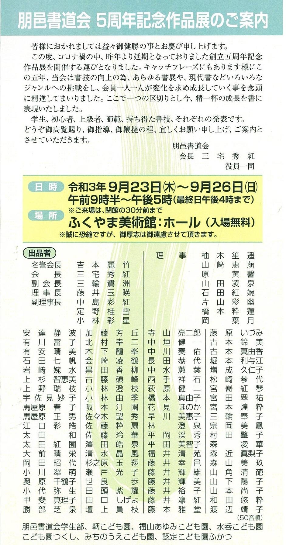 | 展覧会名 会期 会場 団体・代表名 | 朋邑書道会5周年記念作品展 学生展併設 9月23日(木)~9月26日(日) ふくやま美術館 朋邑書道会・三宅秀紅 |