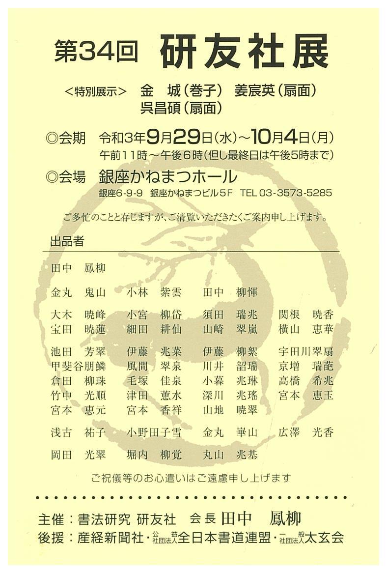 | 展覧会名 会期 会場 団体・代表名 | 第34回研友社展 9月29日(水)~10月4日(月) 銀座かねまつホール 研友社・田中鳳柳 |