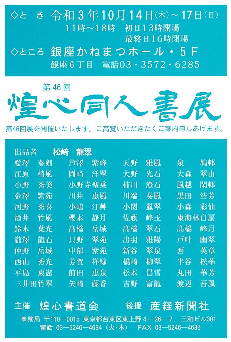 | 展覧会名 会期 会場 団体・代表名 | 第46回煌心同人書展 10月14日(木)~10月17日(日) 銀座かねまつホール 5F 煌心書道会・松﨑龍翠 |