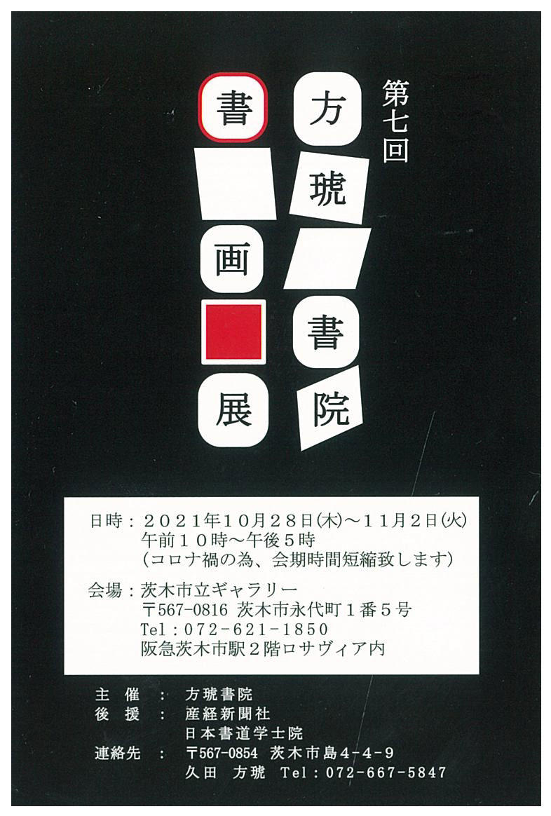 | 展覧会名 会期 会場 団体・代表名 | 第7回方琥書院書画展 10月28日(木)~11月2日(火) 茨木市立ギャラリー 日本書道学士院・久田方琥 |