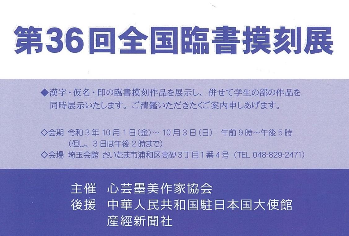 | 展覧会名 会期 会場 団体・代表名 | 第36回全国臨書摸刻展 10月1日(金)~10月3日(日) 埼玉会館 心芸墨美作家協会・岩浅写心 |