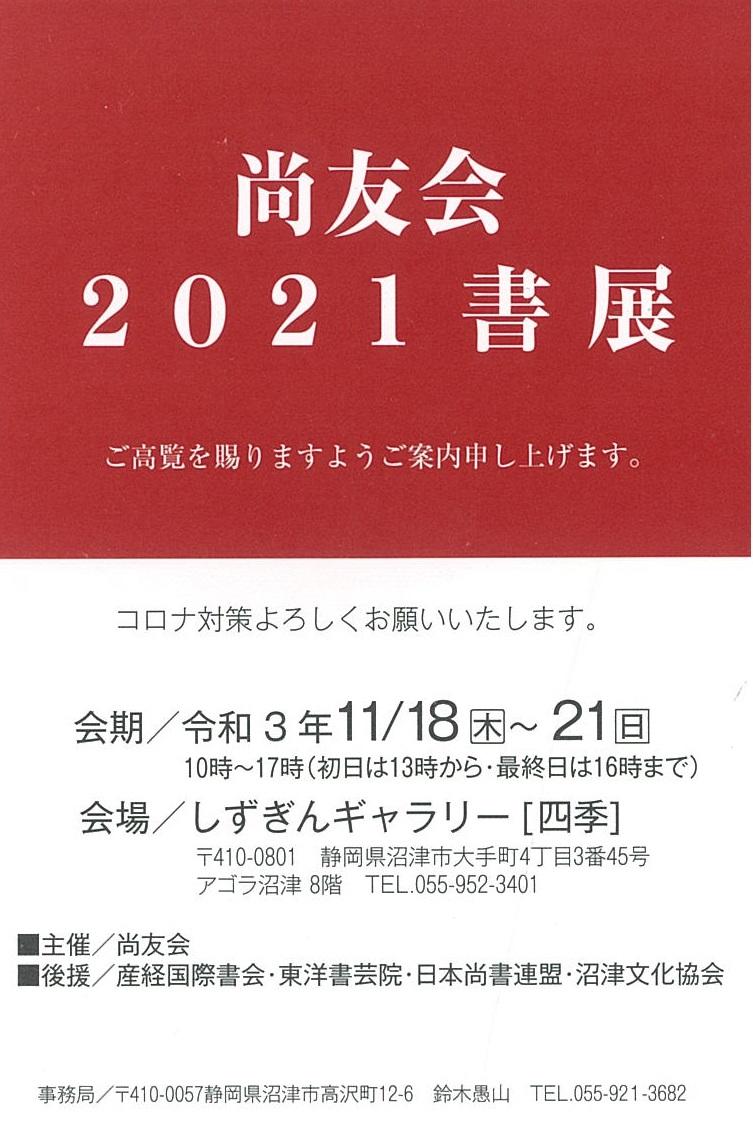 | 展覧会名 会期 会場 団体・代表名 | 尚友会 2021書展 11月18日(木)~11月21日(日) しずぎんギャラリー 尚友会・小杉修史 |