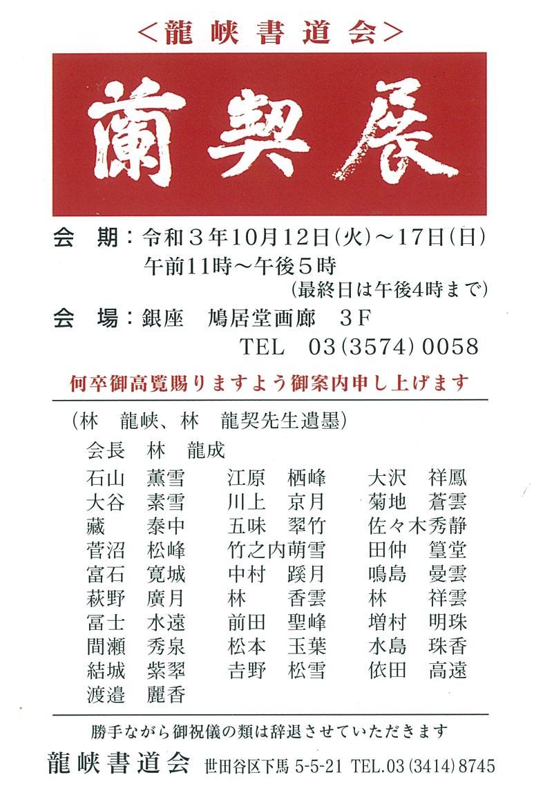 | 展覧会名 会期 会場 団体・代表名 | <龍峡書道会>蘭契展 10月12日(火)~10月17日(日) 銀座鳩居堂画廊 龍峡書道会・林龍成 |