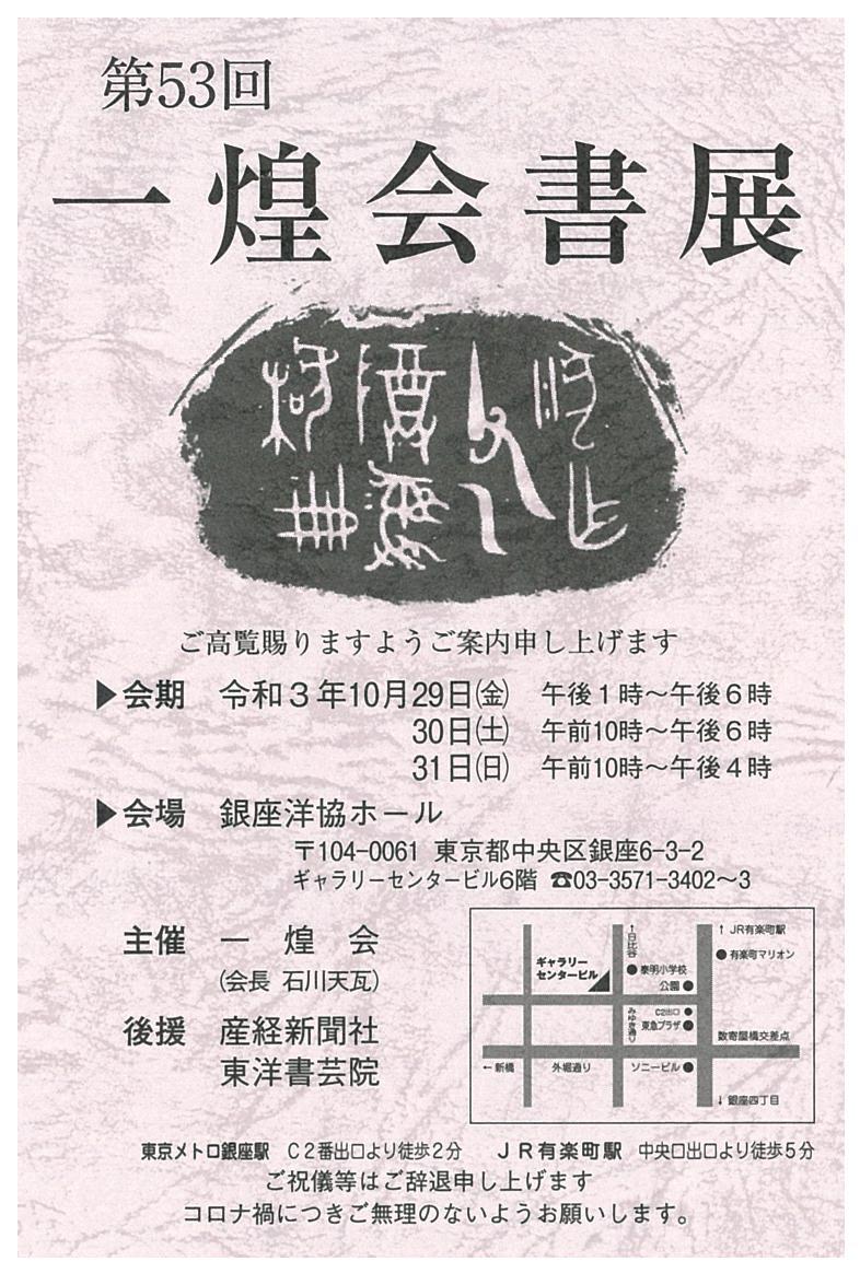 | 展覧会名 会期 会場 団体・代表名 | 第53回一煌会書展 10月29日(金)~10月31日(日) 銀座洋協ホール 一煌会・石川天瓦 |