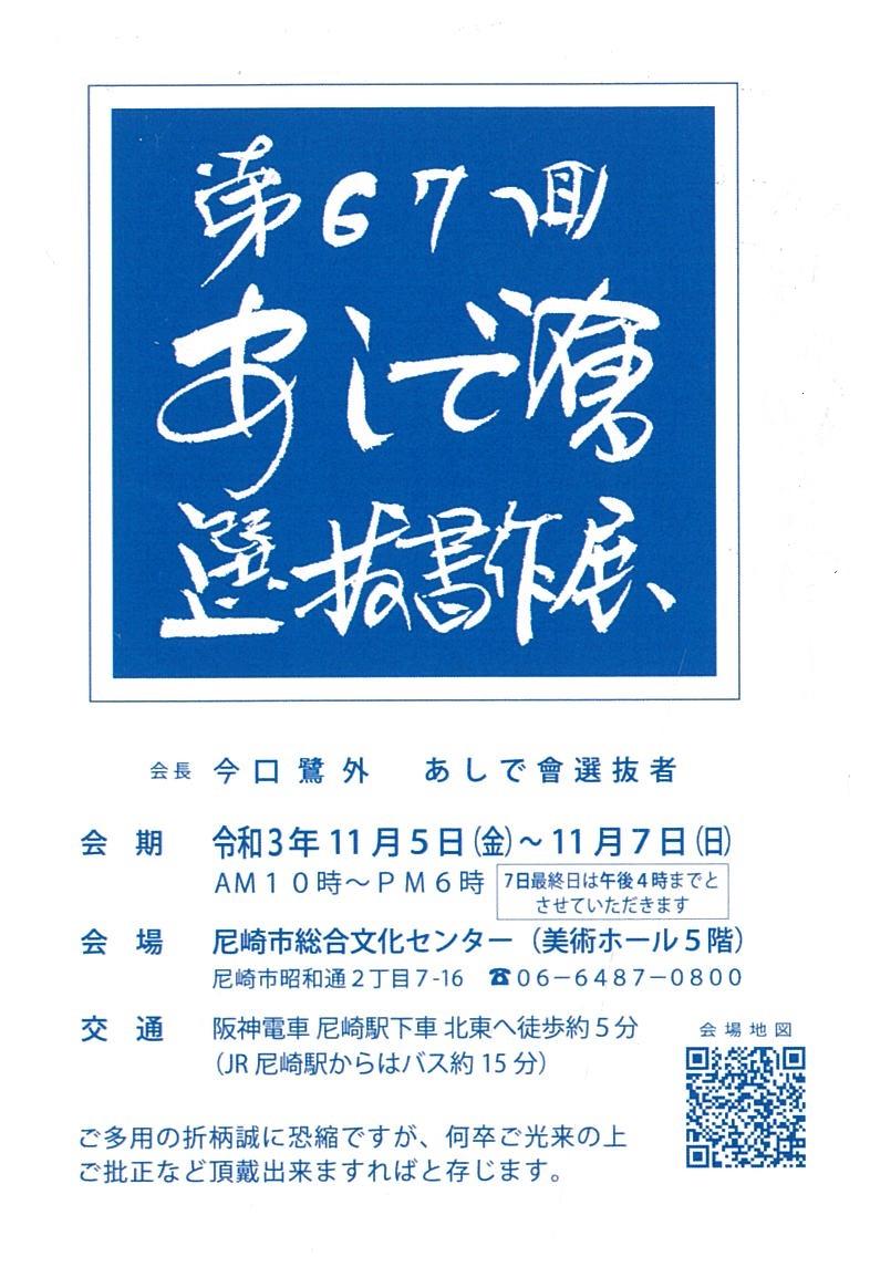 | 展覧会名 会期 会場 団体・代表名 | 第67回 あしで會選抜書作展 11月5日(金)~11月7日(日) 尼崎市総合文化センター あしで会・今口鷺外 |