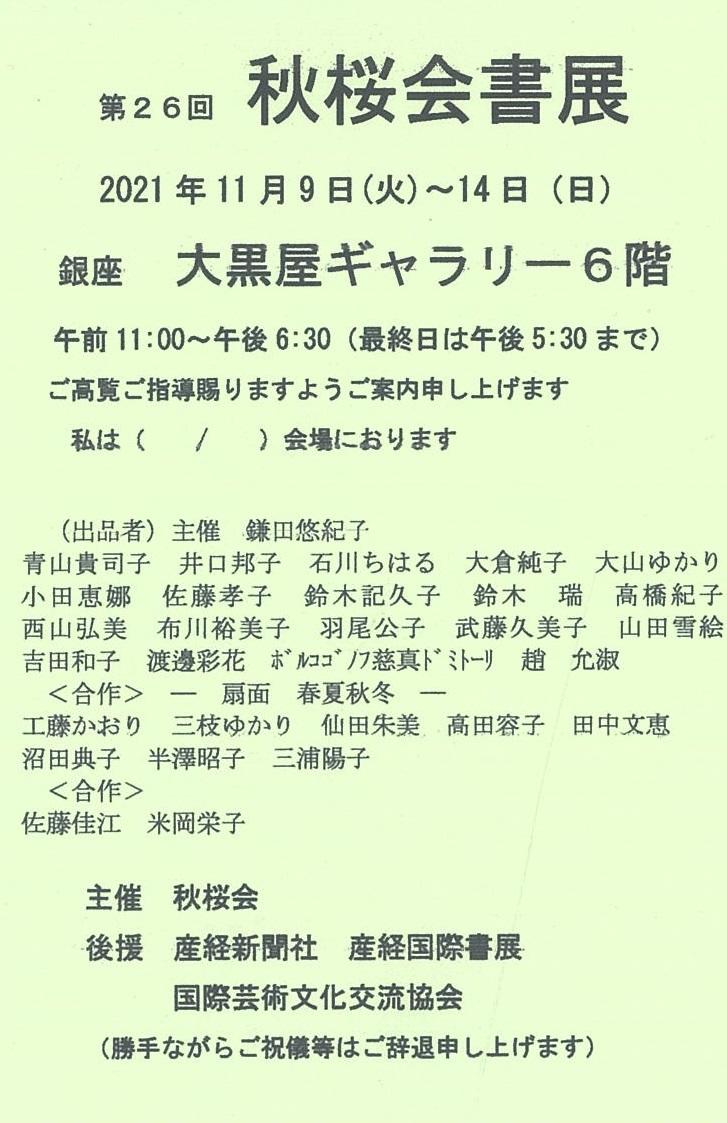 | 展覧会名 会期 会場 団体・代表名 | 第26回 秋桜会書展 11月9日(火)~11月14日(日) 銀座・大黒屋ギャラリー 鎌田悠紀子 秋桜会 |