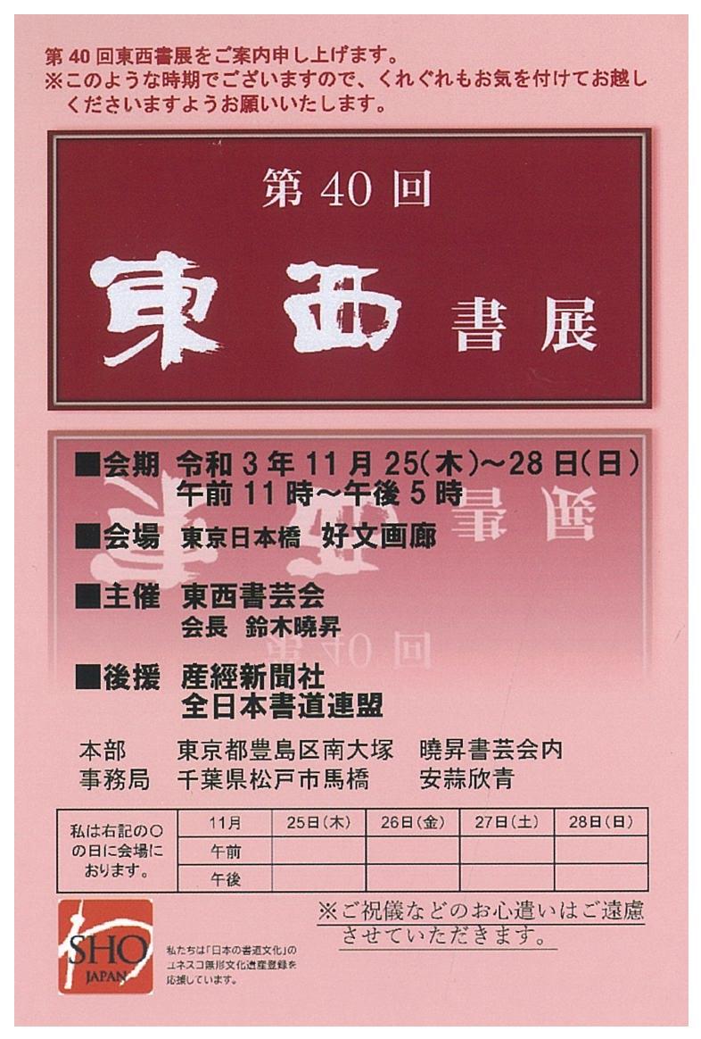 | 展覧会名 会期 会場 団体・代表名 | 第40回 東西書展 11月25日(木)~11月28日(日) 日本橋 好文画廊 東西書芸会・鈴木暁昇 |
