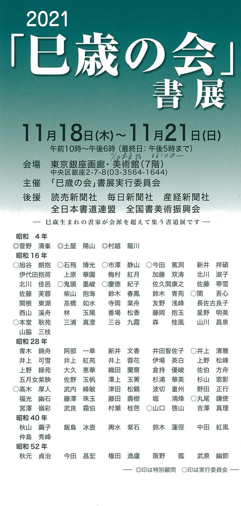 | 展覧会名 会期 会場 団体・代表名 | 第5回「巳歳の会」書展 11月18日(木)~11月21日(日) 東京銀座画廊美術館 今田篤洞(事務局) |