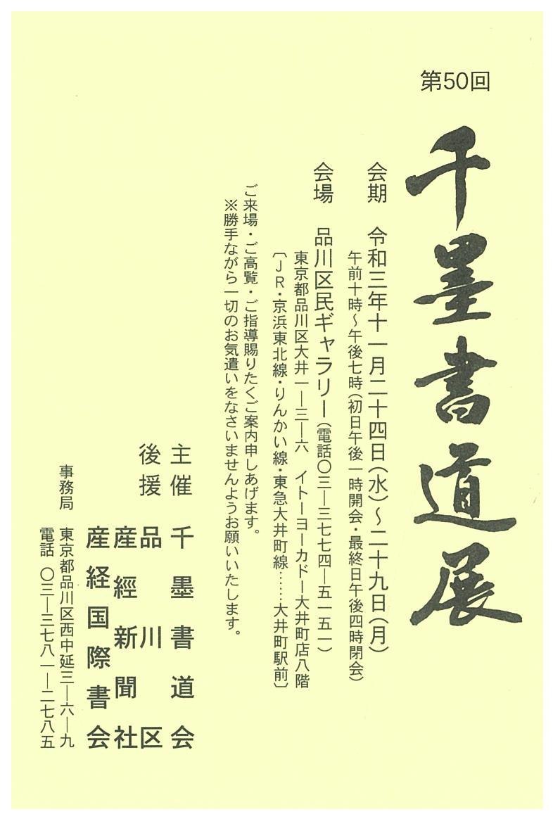 | 展覧会名 会期 会場 団体・代表名 | 第50回 千墨書道展 11月24日(水)~11月29日(月) 品川区民ギャラリー 千墨書道会 |