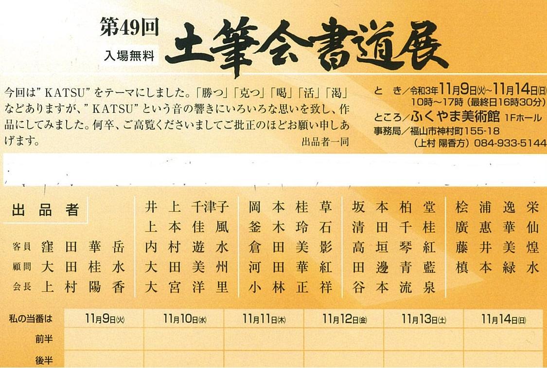 | 展覧会名 会期 会場 団体・代表名 | 第49回 土筆会書道展 11月9日(火)~11月14日(日) ふくやま美術館 上村陽香 土筆会 |