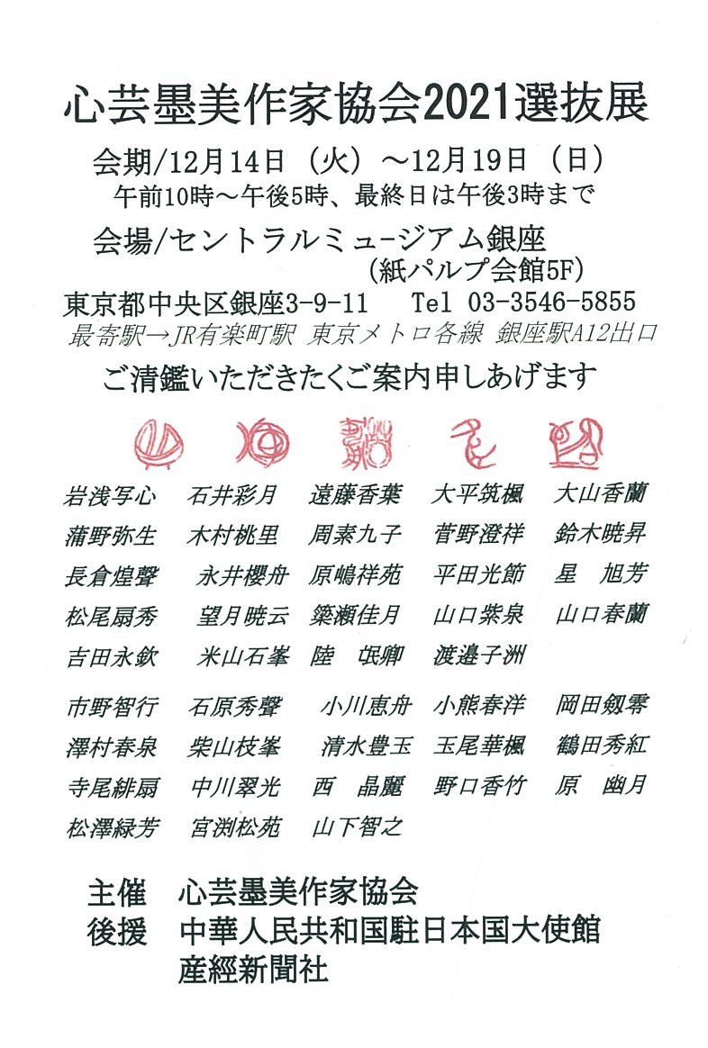 | 展覧会名 会期 会場 団体・代表名 | 心芸墨美作家協会2021選抜展 12月14日(火)~12月19日(日) セントラルミュージアム銀座 心芸墨美作家協会・岩浅写心 |