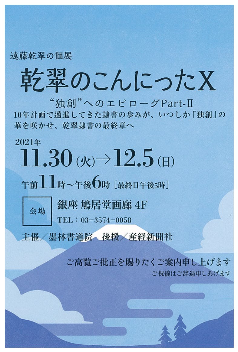 | 展覧会名 会期 会場 団体・代表名 | 乾翠のこんにったⅩ 11月30日(火)~12月5日(日) 銀座鳩居堂 墨林書道院・遠藤乾翠 |