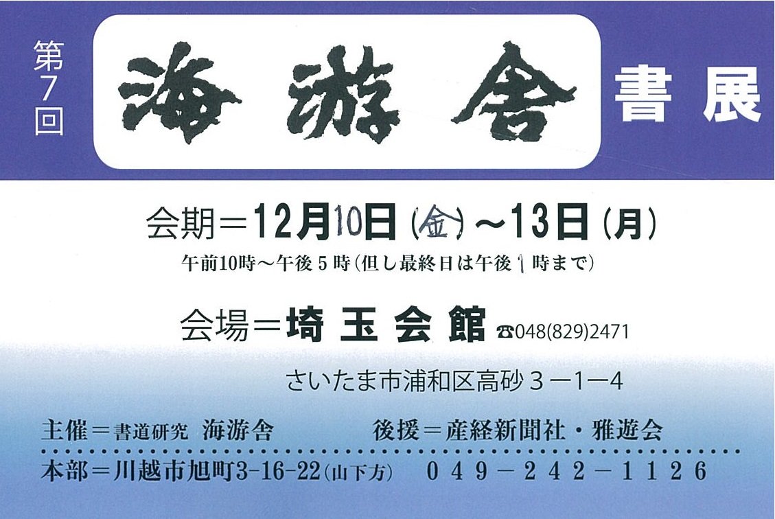 | 展覧会名 会期 会場 団体・代表名 | 第7回 海游舎書展 12月9日(木)~12月13日(月) 埼玉会館 海游舎・山下海堂 |