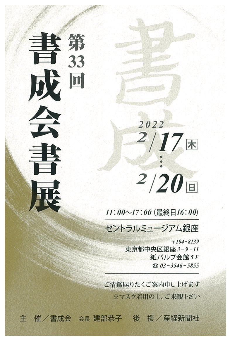 | 展覧会名 会期 会場 団体・代表名 | 第33回 書成会書展 2月17日(木)~2月20日(日) セントラルミュージアム銀座 書成会・建部恭子 |