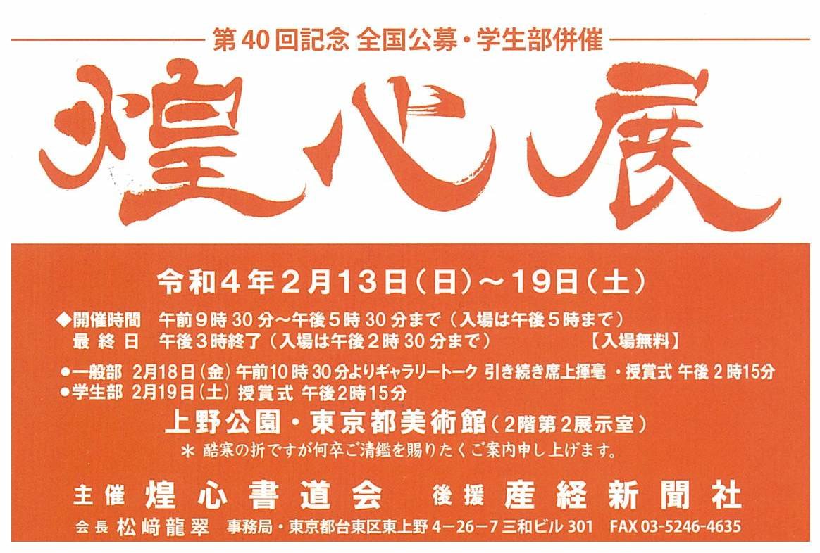 | 展覧会名 会期 会場 団体・代表名 | 第40回記念全国公募・学生部併催煌心展 2月13日(日)~2月19日(土) 東京都美術館 煌心書道会・松﨑龍翠 |
