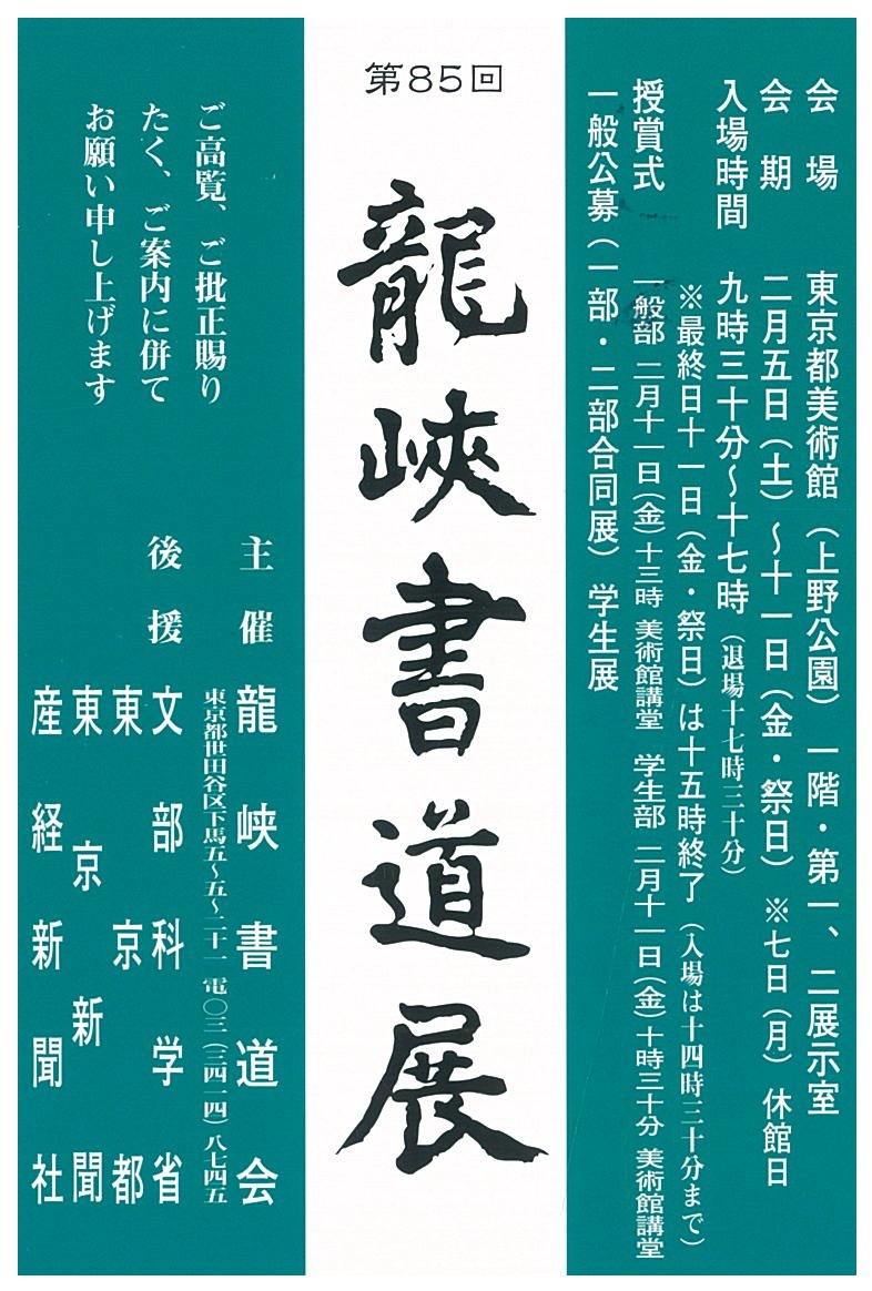 | 展覧会名 会期 会場 団体・代表名 | 第85回 龍峡書道展 2月5日(土)~2月11日(金・祝) 東京都美術館 龍峡書道会・林龍成 |