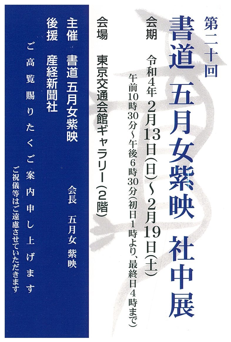 | 展覧会名 会期 会場 団体・代表名 | 第20回 書道五月女紫映社中展 2月13日(日)~2月19日(土) 東京交通会館2階ギャラリー 書道五月女紫映・五月女紫映 |