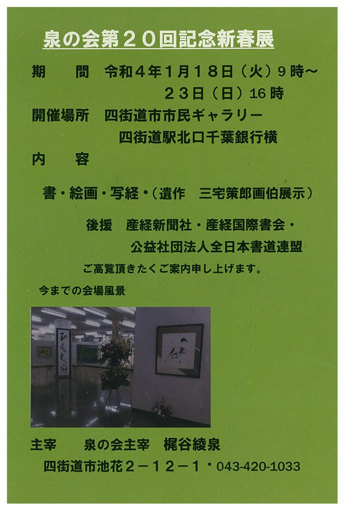| 展覧会名 会期 会場 団体・代表名 | 泉の会第20回記念新春展 1月18日(火)~1月23日(日) 四街道市民ギャラリー 泉の会・梶谷稜泉 |