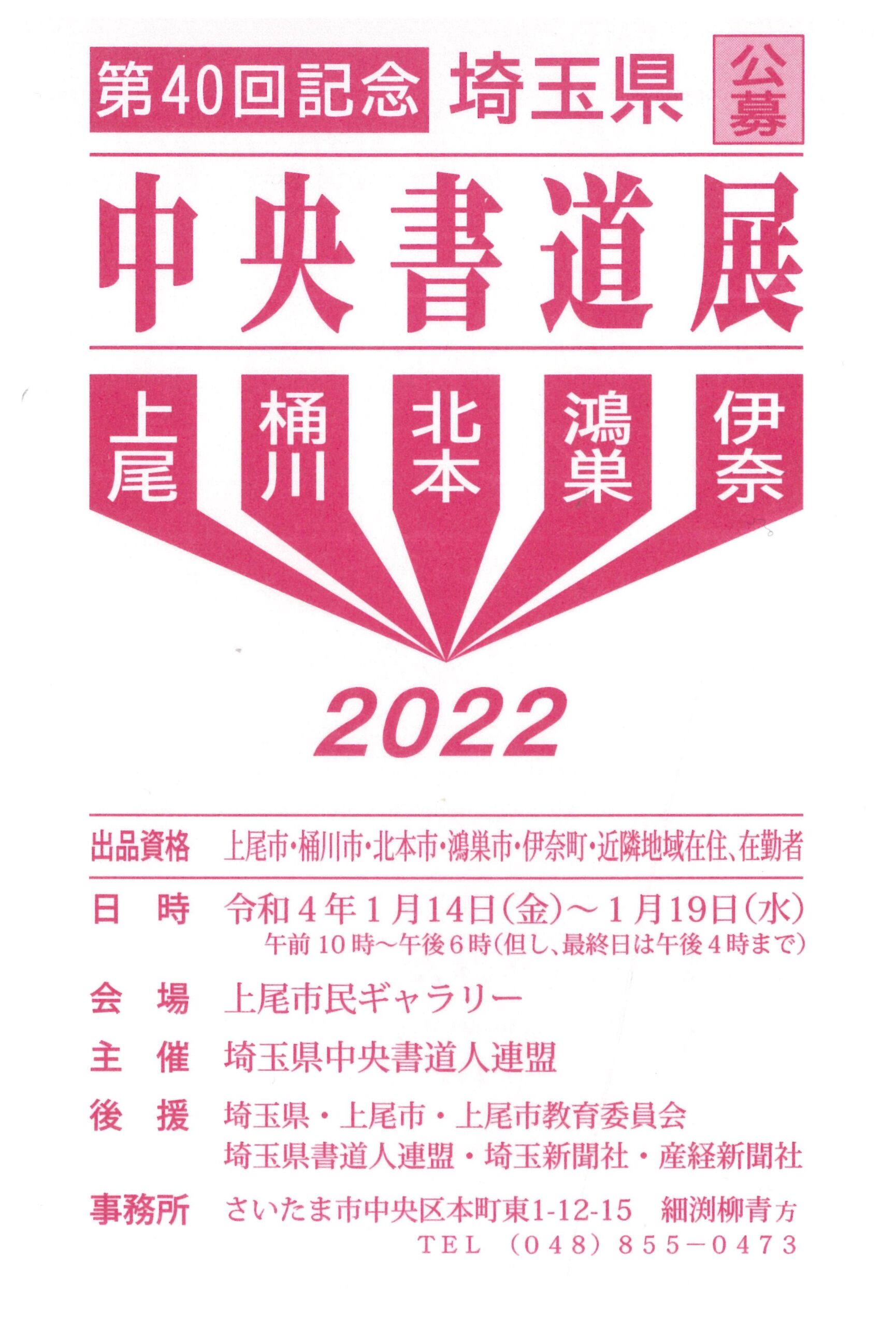 | 展覧会名 会期 会場 団体・代表名 | 第40回埼玉県中央書道展 1月14日(金)~1月19日(水) 上尾市民ギャラリー 埼玉県中央書道人連盟・大場光綵 |