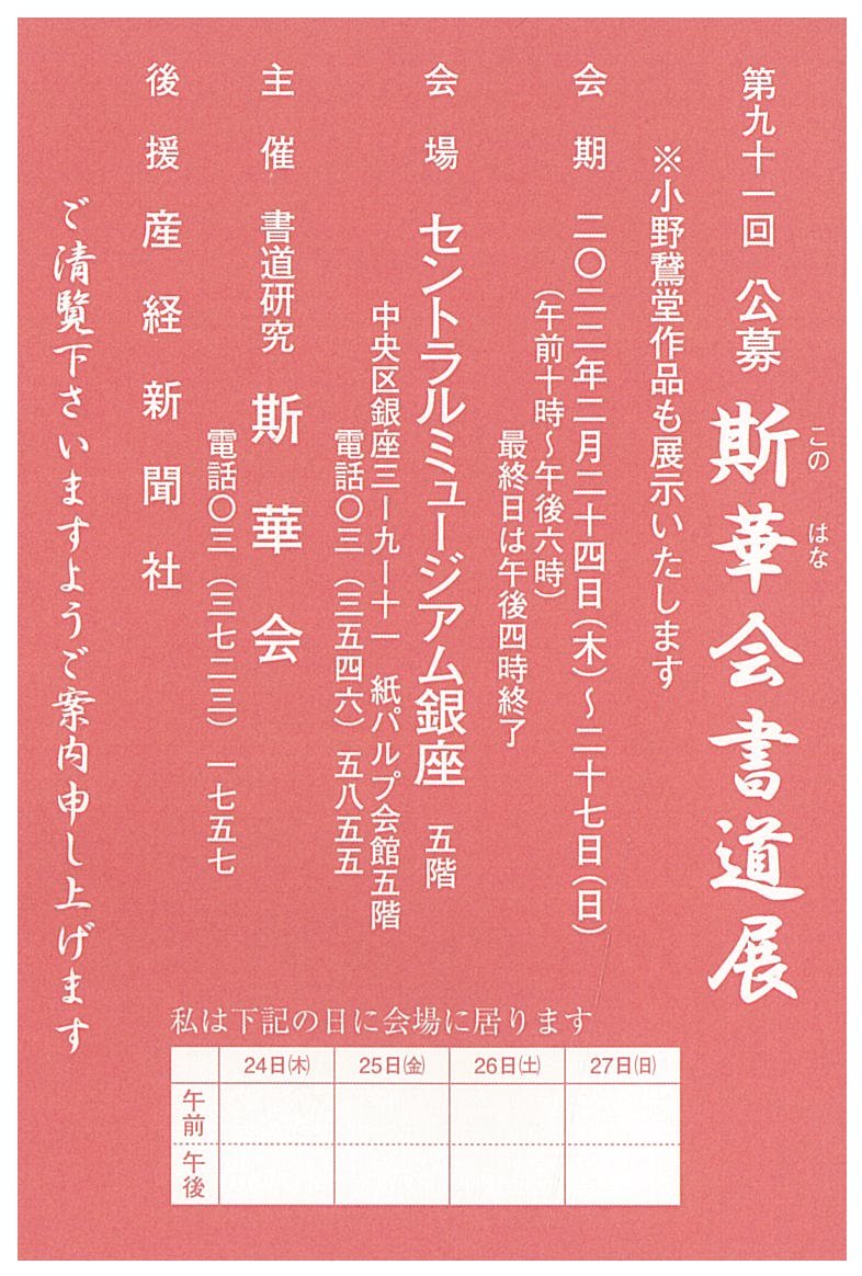 | 展覧会名 会期 会場 団体・代表名 | 第91回公募斯華会書道展 2月24日(木)~2月27日(日) セントラルミュージアム銀座 斯華会・小野之右 |