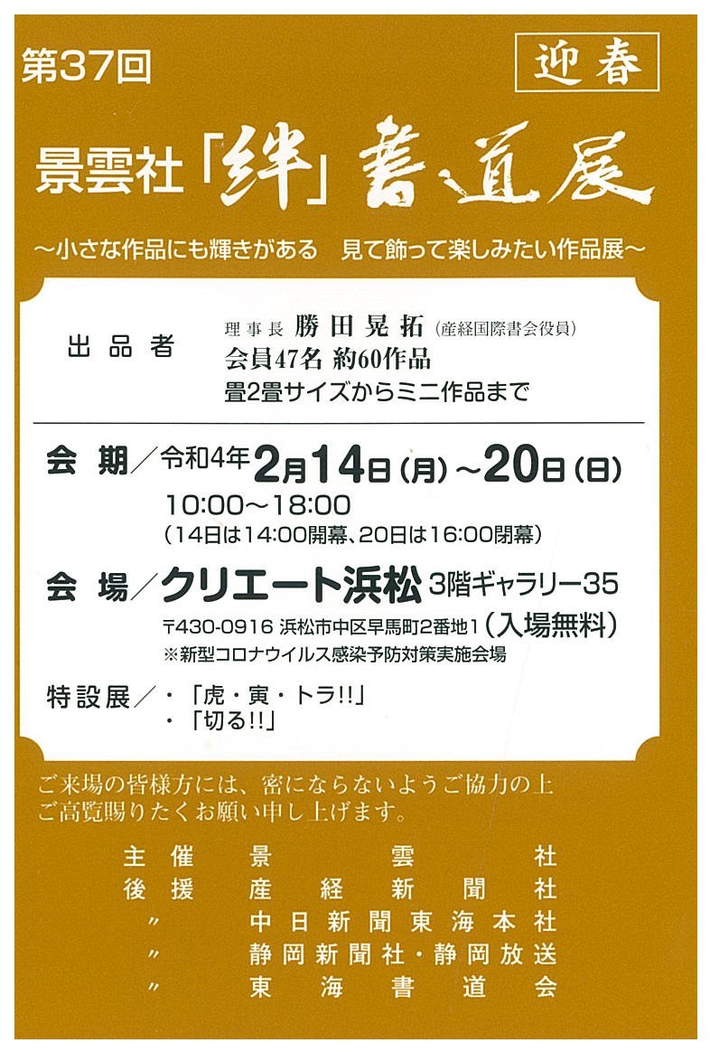 | 展覧会名 会期 会場 団体・代表名 | 第37回景雲社「絆」書道展 2月14日(月)~2月20日(日) クリエート浜松ギャラリー35 景雲社・勝田晃拓 |