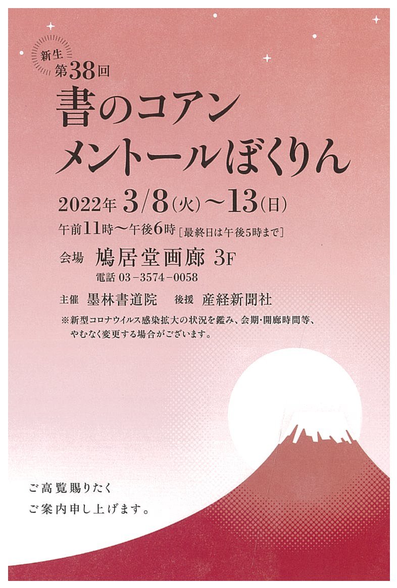 | 展覧会名 会期 会場 団体・代表名 | 第38回 書のコアンメントールぼくりん 3月8日(火)~3月18日(日) 鳩居堂画廊 3F 墨林書道院 |
