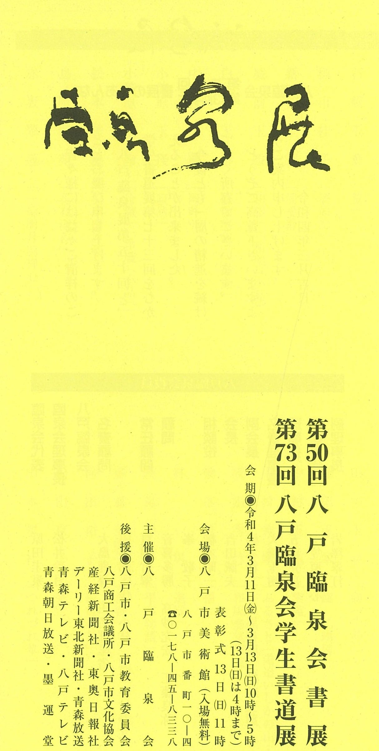 | 展覧会名 会期 会場 団体・代表名 | 第50回八戸臨泉会書展・第73回八戸臨泉会学生書道展 3月11日(金)~3月13日(日) 八戸市美術館 臨泉会・原田圭泉 |
