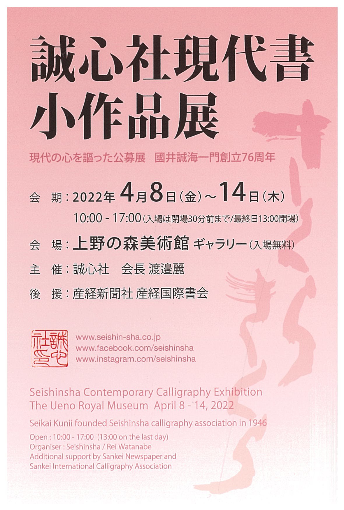 | 展覧会名 会期 会場 団体・代表名 | 2022年誠心社現代書小作品展 4月8日(金)~4月14日(木) 上野の森美術館ギャラリー 誠心社・渡邊麗 |
