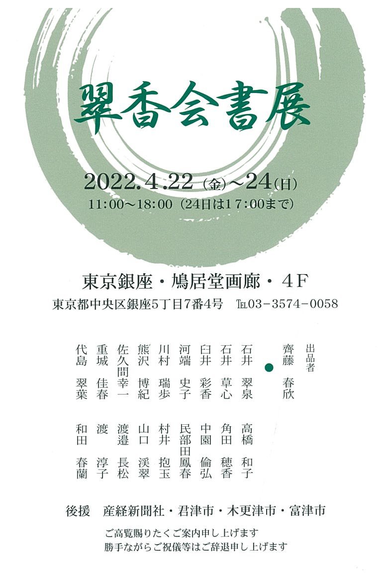 | 展覧会名 会期 会場 団体・代表名 | 翠香会書展 4月22日(金)~4月24日(日) 銀座鳩居堂画廊 4階 翠香会・齊藤春欣 |