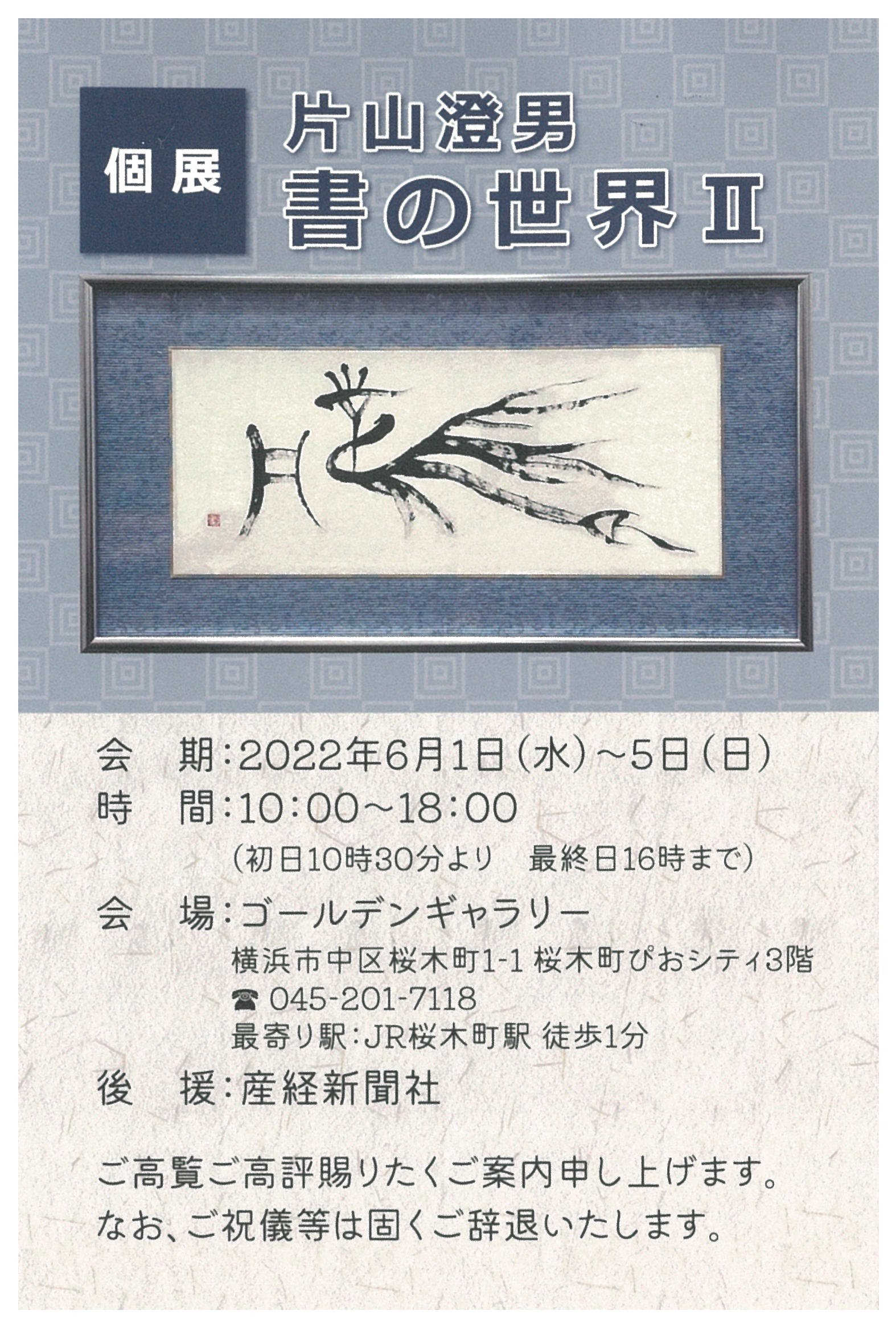 | 展覧会名 会期 会場 団体・代表名 | 個展 片山澄男 書の世界II 6月1日(水)~6月5日(日) ゴールデンギャラリー(横浜) 子龍会・片山澄男 |