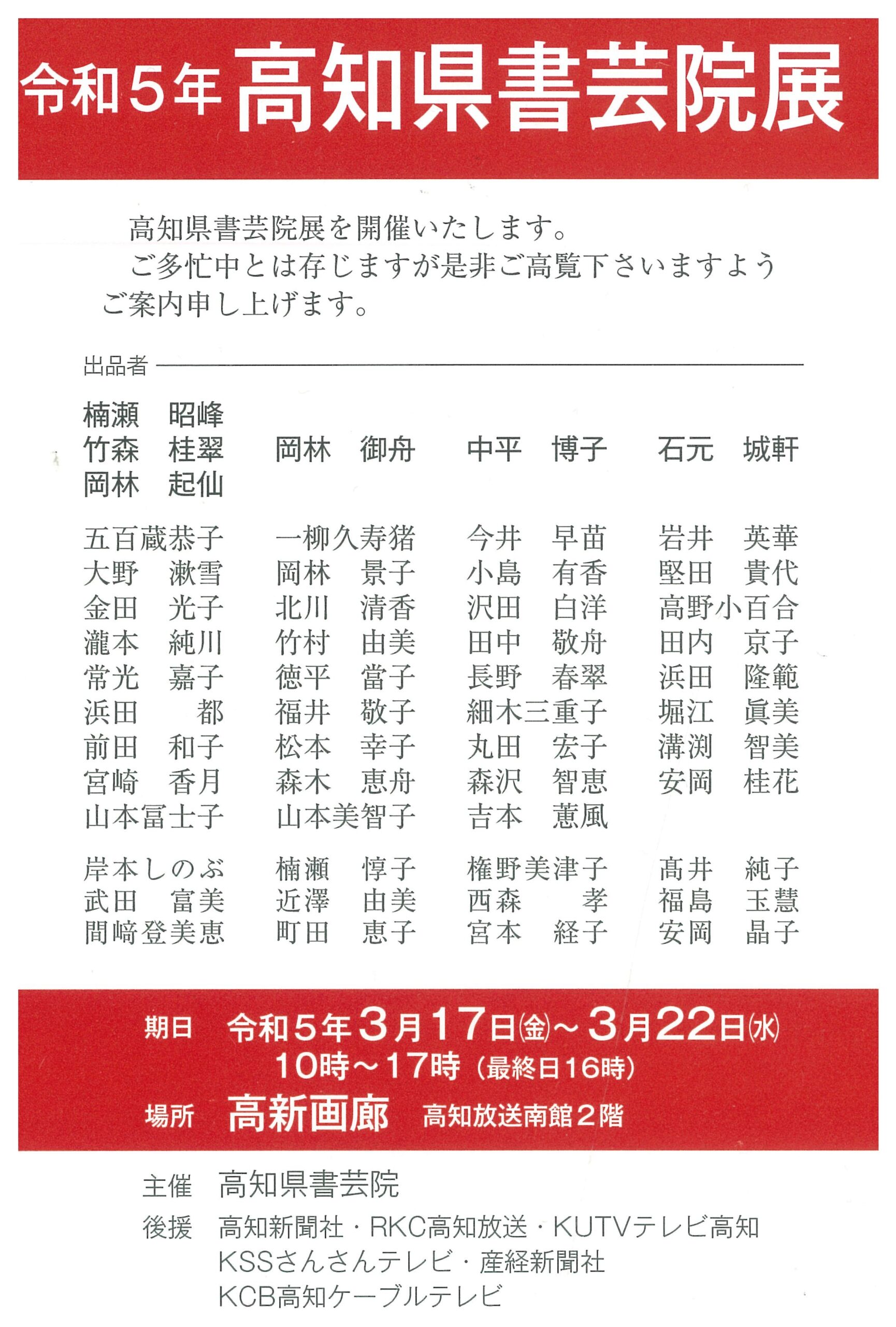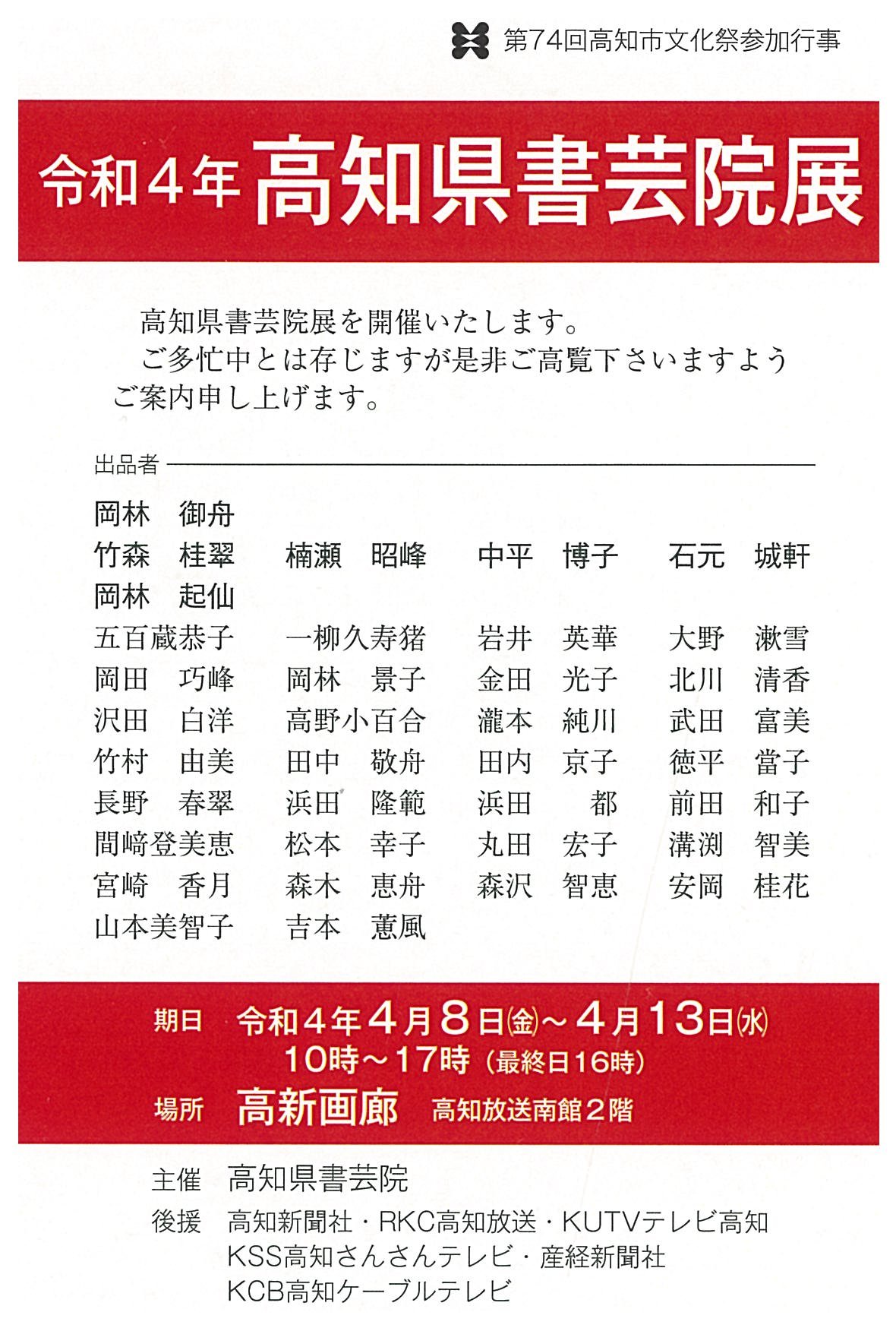 | 展覧会名 会期 会場 団体・代表名 | 令和4年 高知県書芸隱展 4月8日(金)~4月13日(水) 高新画廊 高知県書芸院 |