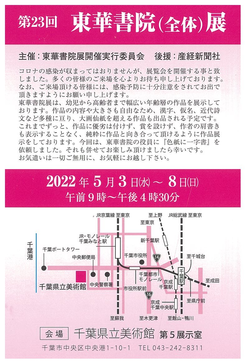 | 展覧会名 会期 会場 団体・代表名 | 第23回東華書院展 5月3日(火)~5月6日(金) 千葉県立美術館 東華書院・齊藤華秀 |