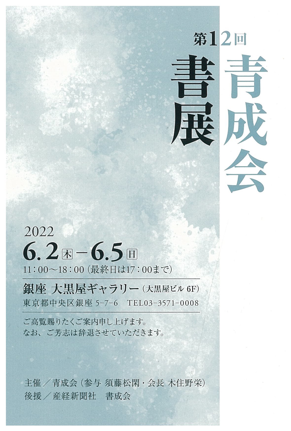 | 展覧会名 会期 会場 団体・代表名 | 第12回青成会書展 6月2日(木)~6月5日(日) 銀座大黒屋ギャラリー 青成会・木住野栄 |