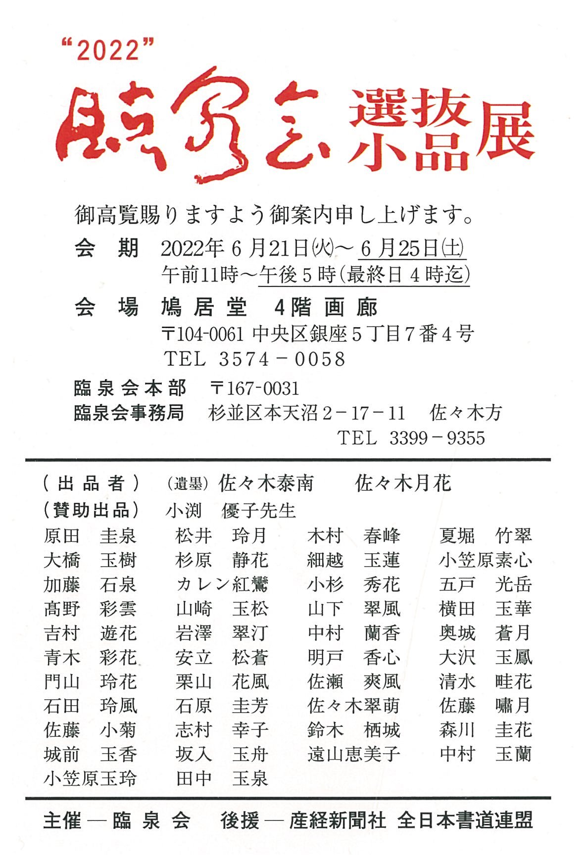 | 展覧会名 会期 会場 団体・代表名 | 2022 臨泉会選抜小品展 6月21日(火)~6月25日(土) 銀座鳩居堂画廊・4階 臨泉会・原田圭泉 |